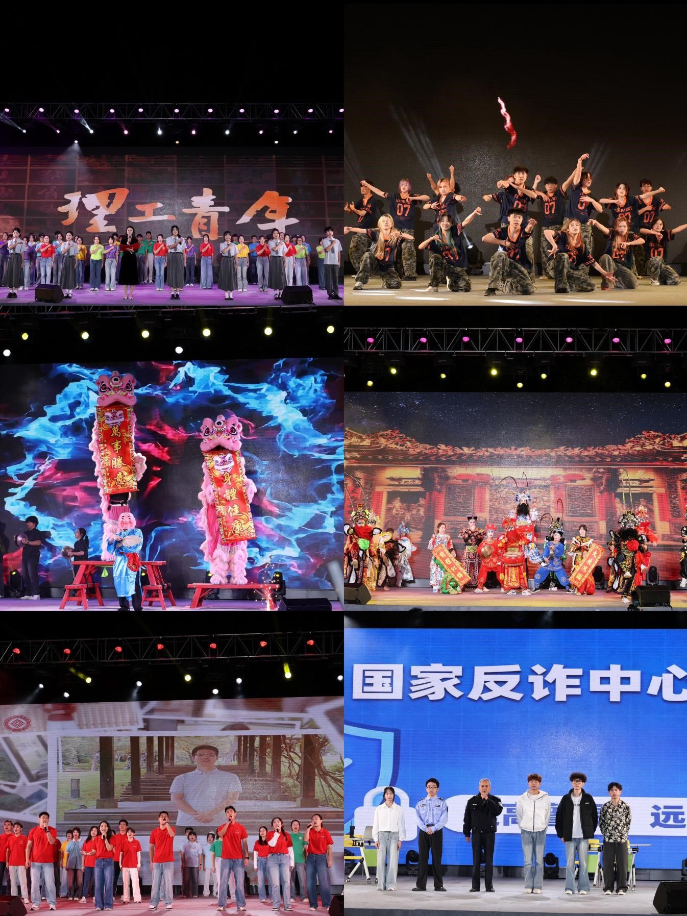 随着灯光流转,晚会步入“追逐光”篇章。舞蹈《心中的红》、师生朗诵《理工青年,向时代报告》及合唱《我信我的明天》,以肢体语言、铿锵誓言与悠扬歌声,传递对红色信仰、时代使命与未来梦想的追逐。“成为光”篇章中,舞蹈《春望》勾勒青春活力;话剧社《“贷”价》以幽默剧情科普反诈知识,平安高校工作站驻校警官也参与了表演;新生辅导员合唱《南粤辅导员之歌》诠释育人初心,展现青春成长中沉淀力量、绽放光彩的过程。最后,“散发光”篇章将氛围推向顶峰。学生社团展演《万象绘新程》融合武术、英歌舞等传统文化元素,歌曲串烧《追光・相逢・向未来》串联师生校友温情,舞蹈《拾光新・缀新途》以潮流街舞收尾,让“光”从个体闪耀汇聚成集体力量。